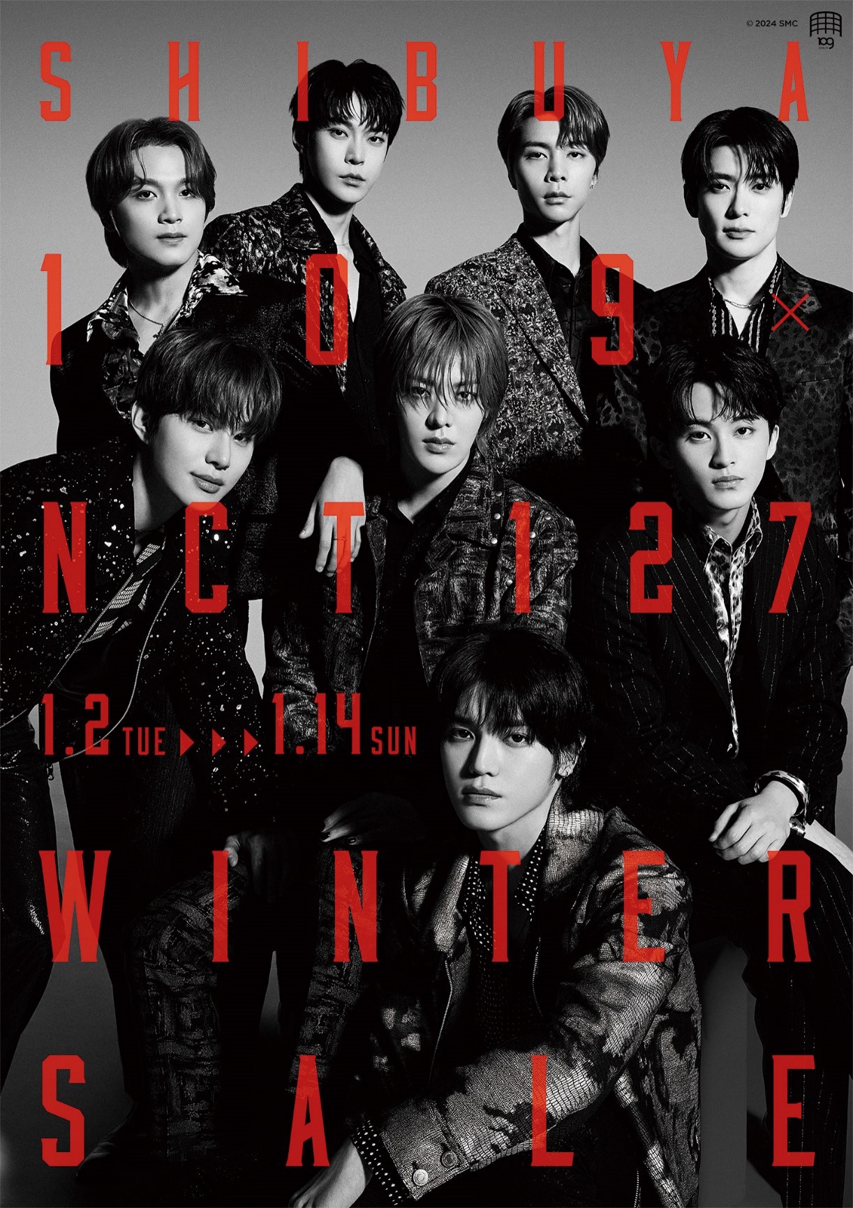 株式会社SHIBUYA109エンタテイメント(本社:東京都渋谷区、代表取締役社長:石川あゆみ)は、東京・渋谷で運営する「SHIBUYA109渋谷店」「MAGNET by SHIBUYA109」、及び「SHIBUYA109阿倍野店」(大阪府大阪市)の3施設にて、2024年1月2日(火)~1月14日(日)の期間、話題のグローバルボーイズグループ「NCT 127」(エヌシーティー 127)をキャンペーンモデルに起用した『SHIBUYA109 × NCT 127 WINTER SALE』 『MAGNET by SHIBUYA109 × NCT 127 WINTER SALE』を開催いたします。