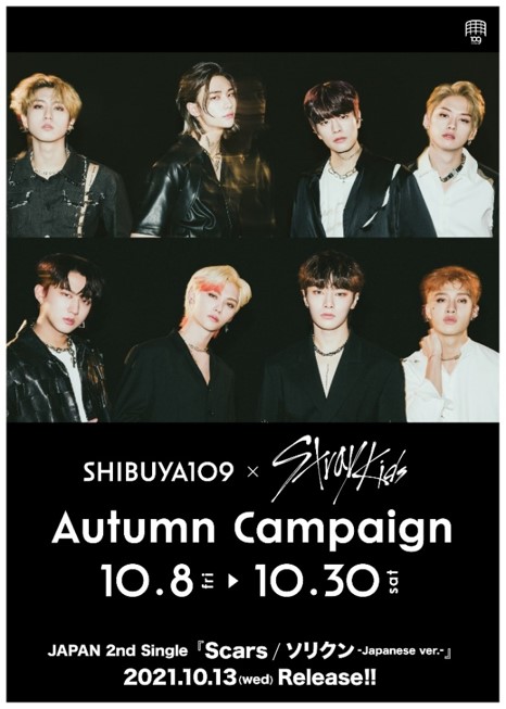 キャンペーン期間中は、「Stray Kids」のビジュアルがSHIBUYA109渋谷店、SHIBUYA109阿倍野店の内外観に掲出されるほか、2021年10月13日(水)にリリースされるJAPAN 2nd Single 『Scars / ソリクン -Japanese ver.-』の発売を記念したポップアップストアが東京・大阪にオープンいたします。さらに、メンバーのサイン入りチェキなどが当たるプレゼント企画や、館内BGMジャックなど、両施設でさまざまな取り組みを行います。