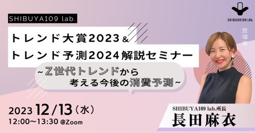 株式会社SHIBUYA109エンタテイメント(本社:東京都渋谷区、代表取締役社長:石川 あゆみ)が運営する若者マーケティング機関『SHIBUYA109 lab.(読み:シブヤイチマルキュウラボ)』は、SHIBUYA109の独自ネットワークに所属するaround20(15~24歳)の女性を対象に調査し決定した2023年トレンド大賞及び2024年トレンド予測に関する解説セミナー(有料)をZoomにて開催いたします。SHIBUYA109 lab.所長の長田が登壇し、2023年話題となった様々なコンテンツ及び2024年話題になると予想されるコンテンツ情報を基にZ世代のトレンド消費予測をわかりやすく解説いたします。トレンド情報やZ世代の消費行動にご興味がある方はぜひご参加ください。