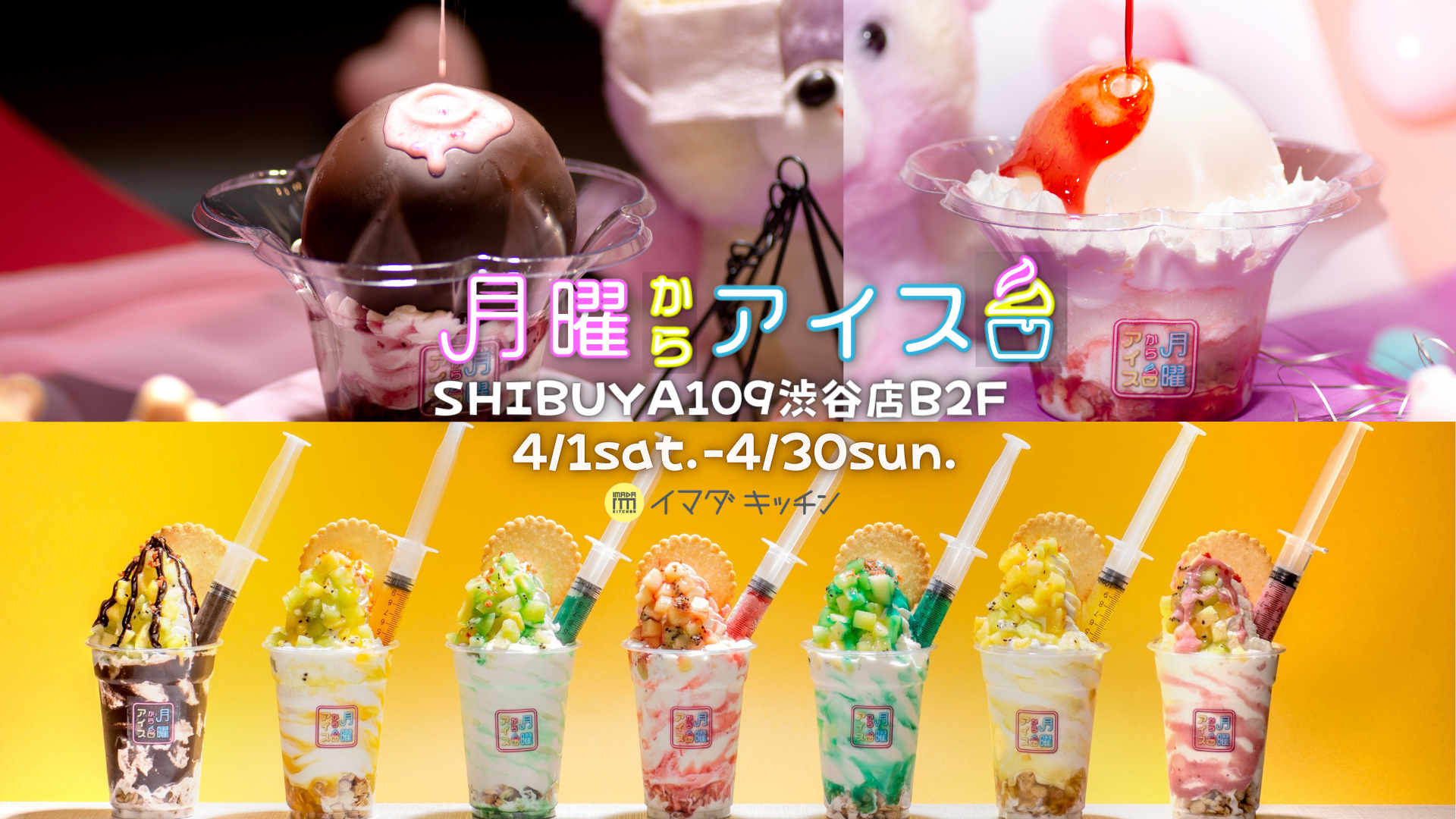 株式会社SHIBUYA109エンタテイメント(本社:東京都渋谷区/代表取締役社長:石川 あゆみ)が運営する「IMADA KITCHEN(イマダ キッチン)」にて、株式会社月曜からアイス(本社:香川県高松市/代表取締役:濱田晋平)が運営する夜アイス専門店「月曜からアイスSHIBUYA109渋谷店」が、2023年4月1日(土)~2023年4月30日(日)の期間限定で出店いたします。