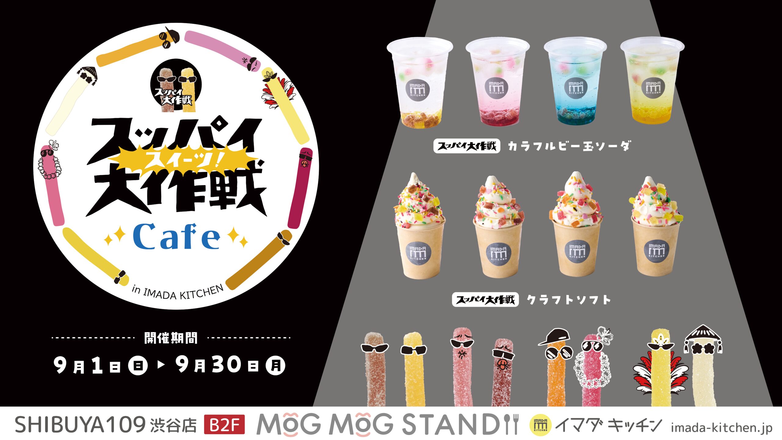 株式会社SHIBUYA109エンタテイメント(本社:東京都渋⾕区/代表取締役社⻑:石川 あゆみ)が運営するSHIBUYA109渋谷店「IMADA KITCHEN(イマダ キッチン)」において、旺旺・ジャパン株式会社(読み:ワンワン・ジャパン/本社:東京都文京区/代表取締役社長:青山 英之)の大人気スティックグミ「スッパイ大作戦」を使用したオリジナルメニューを展開する『スッパイ【スイーツ!】大作戦 Cafe in IMADA KITCHEN』を、2024年9月1日(日)~2024年9月30日(月)の期間限定でオープンいたします。