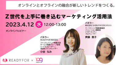 株式会社SHIBUYA109エンタテイメント(本社:東京都渋谷区、社長:石川 あゆみ)は、日本初・国内最大級のクラウドファンディングサービス「READYFOR」を運営するREADYFOR株式会社(本社:東京都千代田区、 代表:米良はるか)と共同で、オンラインウェビナー『オンラインとオフラインの融合が新しいトレンドをつくる。Z世代を上手に巻き込むマーケティング活用法』を2023年4月12日(水)に開催いたします。