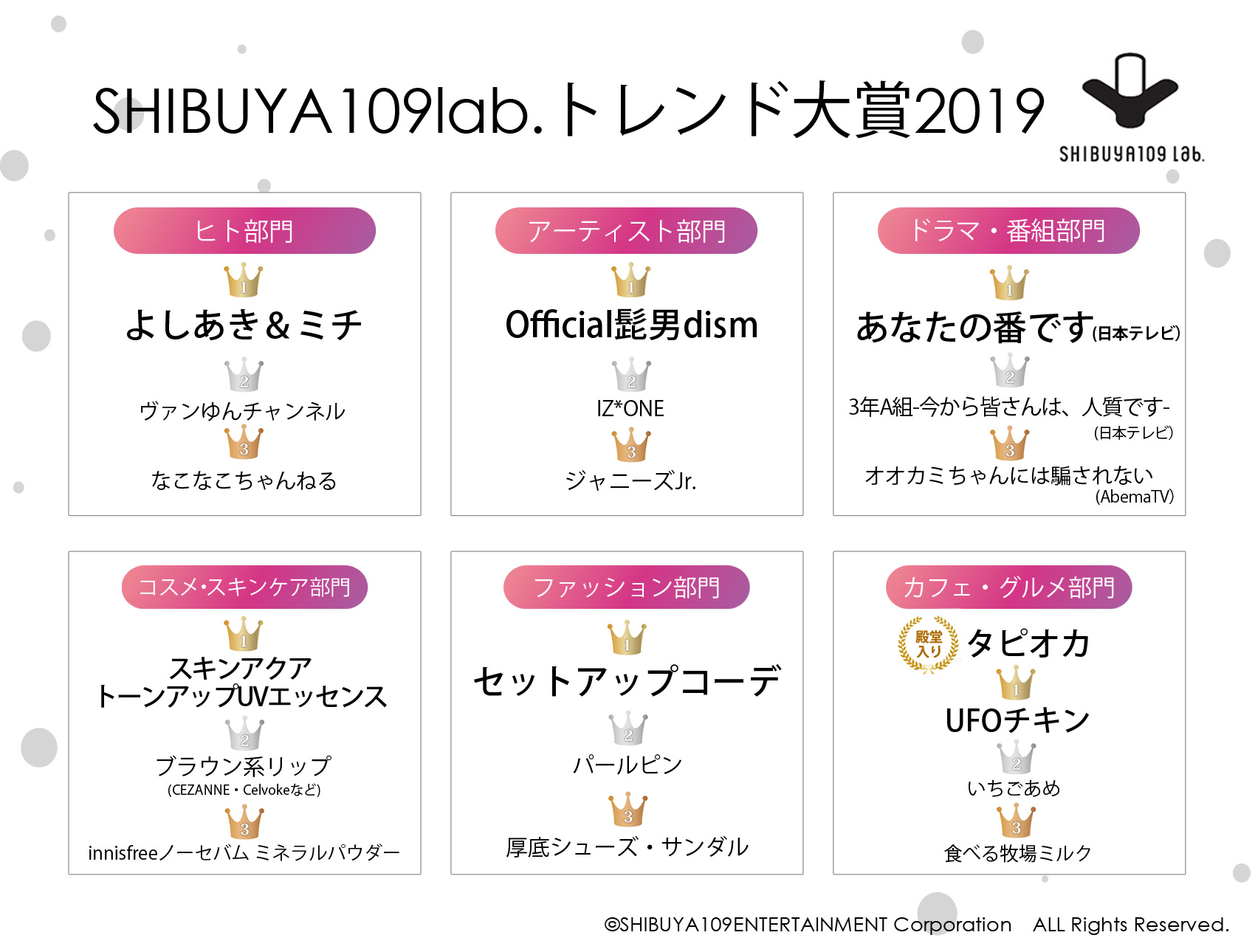 今年は「ヒト部門」「アーティスト部門」「ドラマ・番組部門」「コスメ・スキンケア部門」「ファッション部門」「カフェ・グルメ部門」の6部門でトレンド大賞を決定。ノミネート一覧については、12名の高校生・大学生と選定しました。