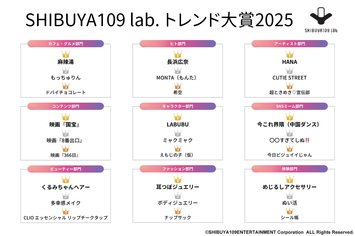 株式会社SHIBUYA109エンタテイメント(本社:東京都渋谷区、代表取締役社長:石川 あゆみ)が運営する若者マーケティング機関『SHIBUYA109 lab.(読み:シブヤイチマルキュウラボ)』は、around20(15~24歳)の女性619人を対象に実施した2025年トレンド調査の結果をお知らせいたします。