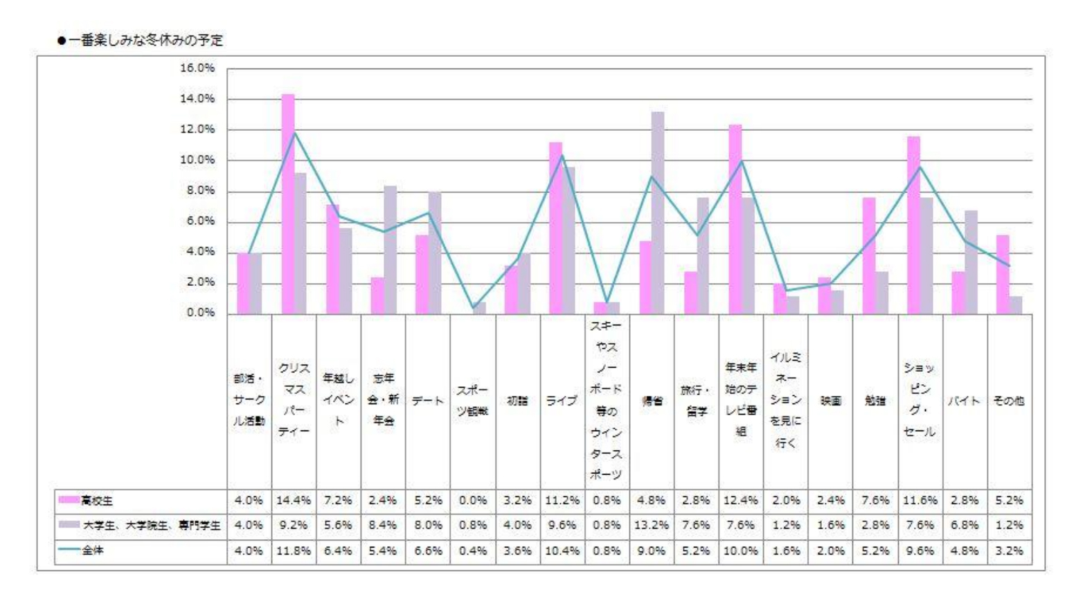 【TOPICS(1)】 冬休みに楽しみにしている予定第1位は「クリスマスパーティー」(11.8%) 女子高生編第 1 位「クリスマスパーティー」(14.4%)、女子大生編第 1 位「帰省」(13.2%)