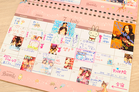 はい、本当は壁掛け用のカレンダーなんですけど、プリを貼って“プリ帳”代わりにしていました。たしか高1は一般的なプリ帳で、高2と高3はこのスタイルだったような…。 |