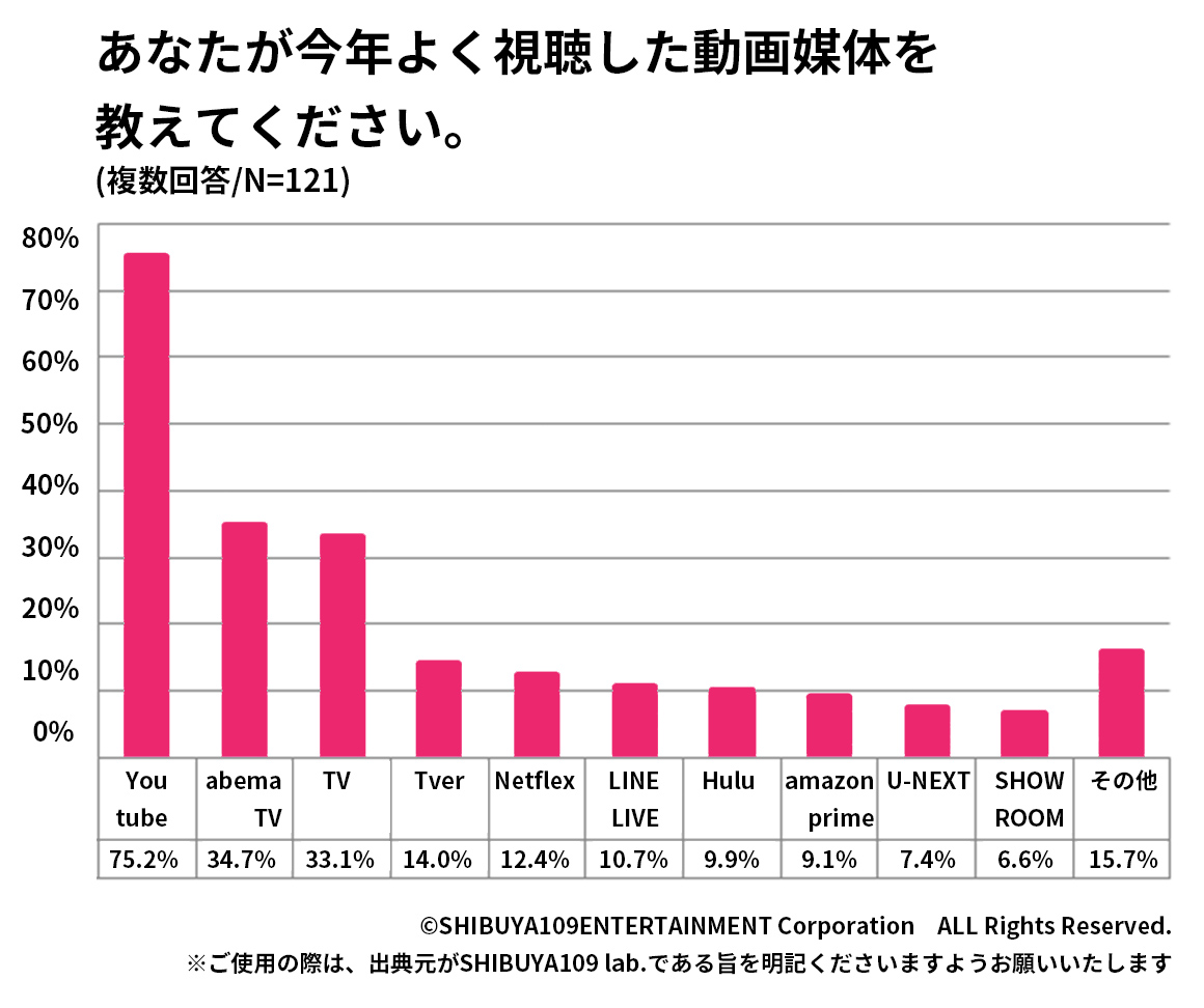 そして今回の調査で「今年よく視聴した動画媒体」を聞いてみたところ、最も視聴されている動画媒体はYoutube(75.2%)という結果がでています。