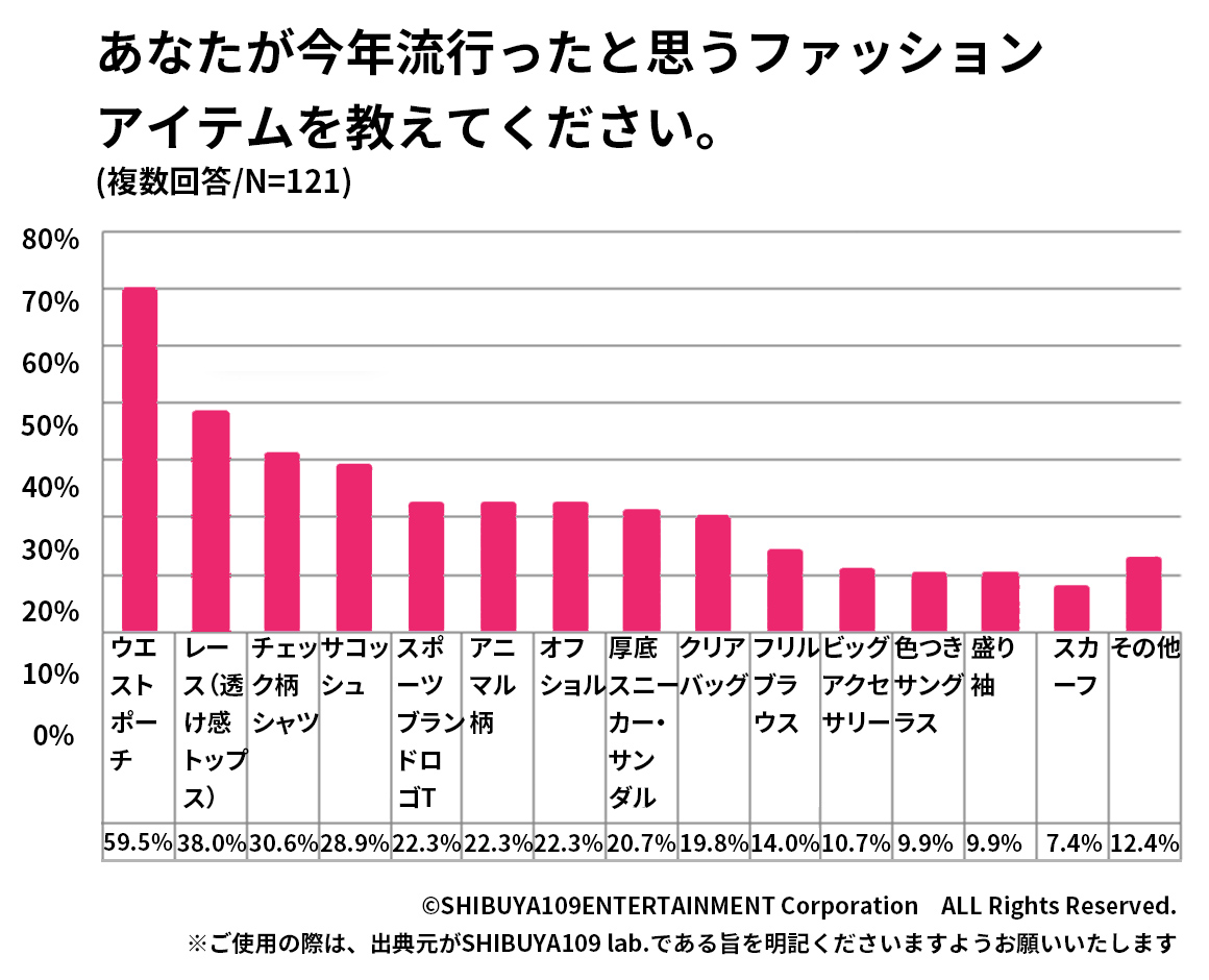 今年流行したファッションは「ウエストポーチ(59.5%)」次いで「レース素材トップス (38.0%)」「チェック柄シャツ(30.6%)」という結果となりました。