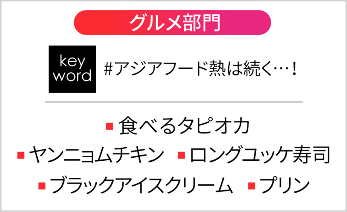 今年のトレンド大賞でも「タピオカ」や「チーズドッグ」などのアジアンフードがランクインしていましたが、2019年もアジアンフードは引き続き注目を集めそうです。