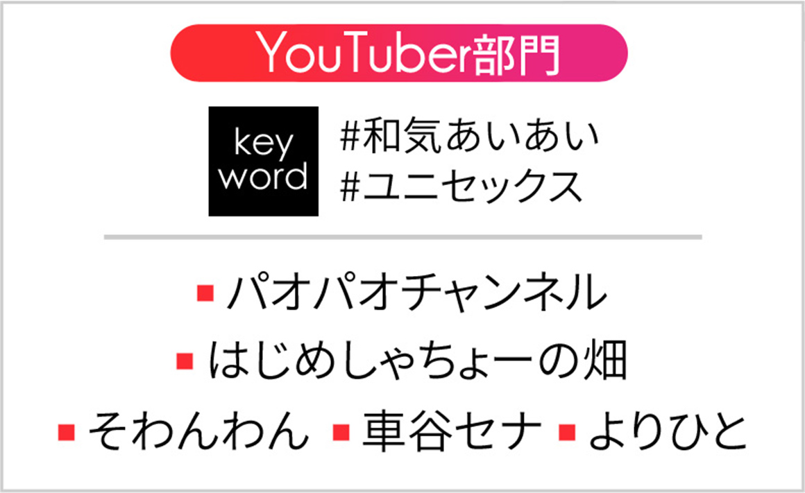 男女2人組のYouTuber「パオパオチャンネル」や男性の美容系YouTuber車谷せなさん、多様性あふれる男女4人組「ヘンジンマジメ」など、性別の垣根を越えたYouTuberが盛り上げていく予感です。