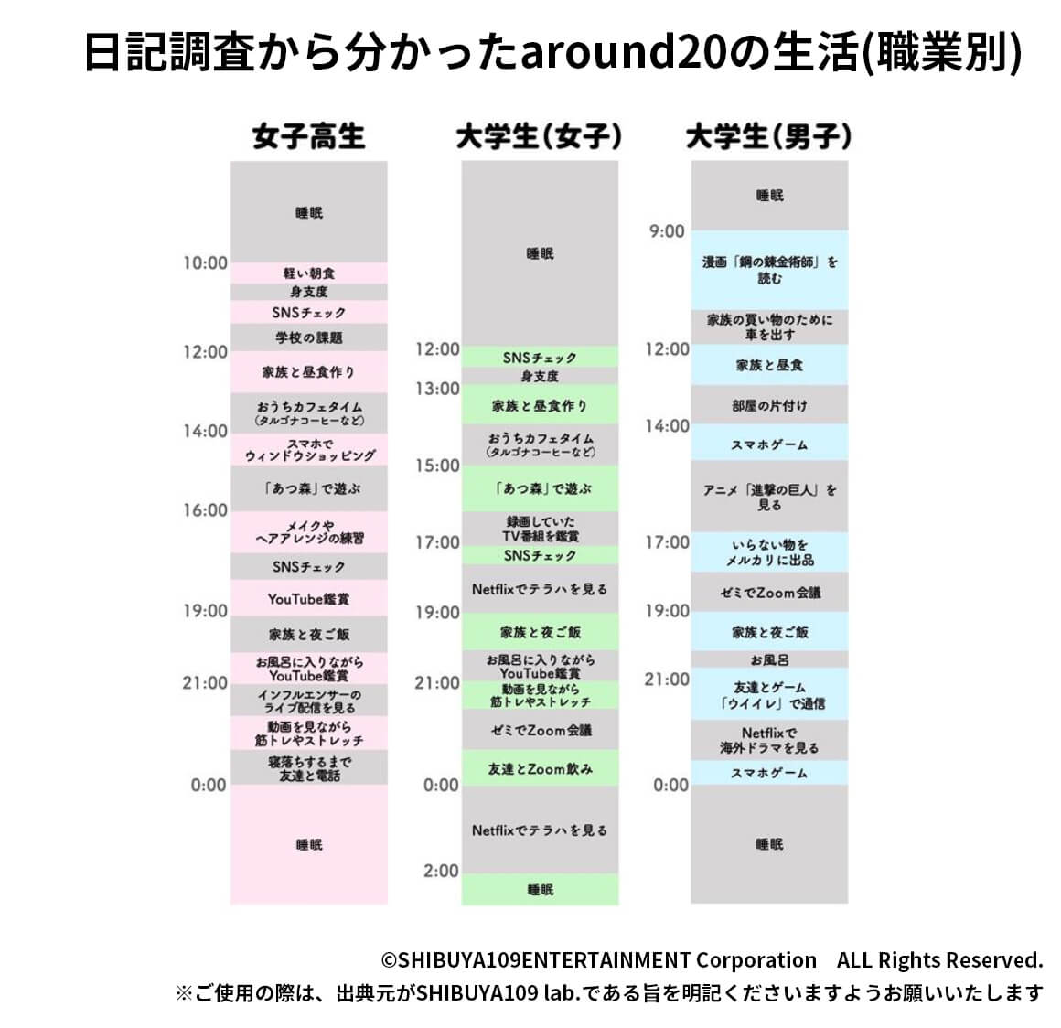 SHIBUYA109 lab.独自ネットワークに属するaround20を対象に、自粛期間中の過ごし方について日記形式で記録してもらう。
