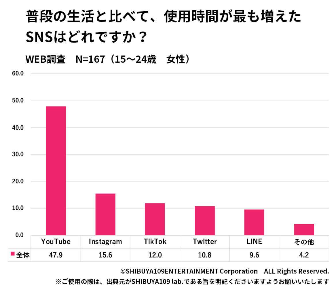 おうちで過ごす時間が増えたことで、スマホを使う時間もいつも以上に増えています。 普段の生活と比べて、使用時間が最も増えたSNSについて聞いたところ、最も多い回答は「YouTube(47.9%)」でした。次いで「Instagram(15.6%)」、「TikTok(12.0%)」という結果となりました。