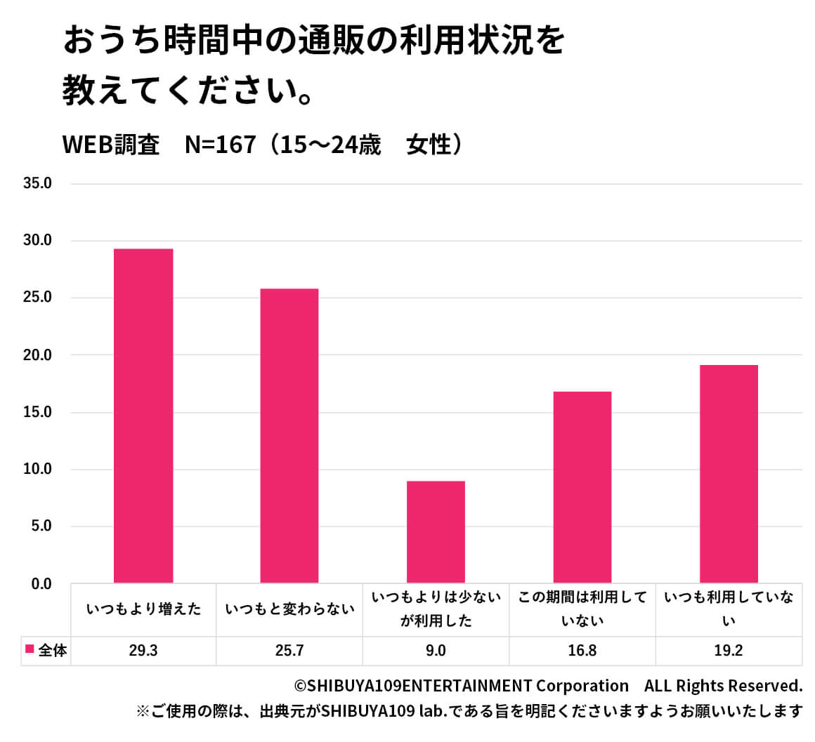 所謂「巣ごもり消費」が加速していますが、around20のお買い物事情はどうなっているのでしょうか。外出自粛期間の通販の利用状況について聞いてみたところ、29.3%の人が「いつもより増えた」と回答し、around20の間でも通販を利用した巣ごもり消費が加速していることが明らかになりました。