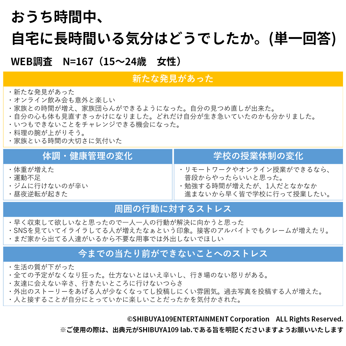 ポジティブな意見としては、「普段やりたいけどできなかったことが沢山できて視野が広がった気がする(高校生) 」といった声や、「時間を気にせずゆっくりと過ごせた(大学生)」などが挙げられました。一方、ネガティブな意見としては、「友達と会えないこととライブに行けないのが辛い(高校生)」や「会って話した方が楽しいし、おしゃれをして外出したい(高校生)」「就活について相談したり、近況報告をする同期や先生に会えないことが不安(大学生)」といった声が挙げられています。