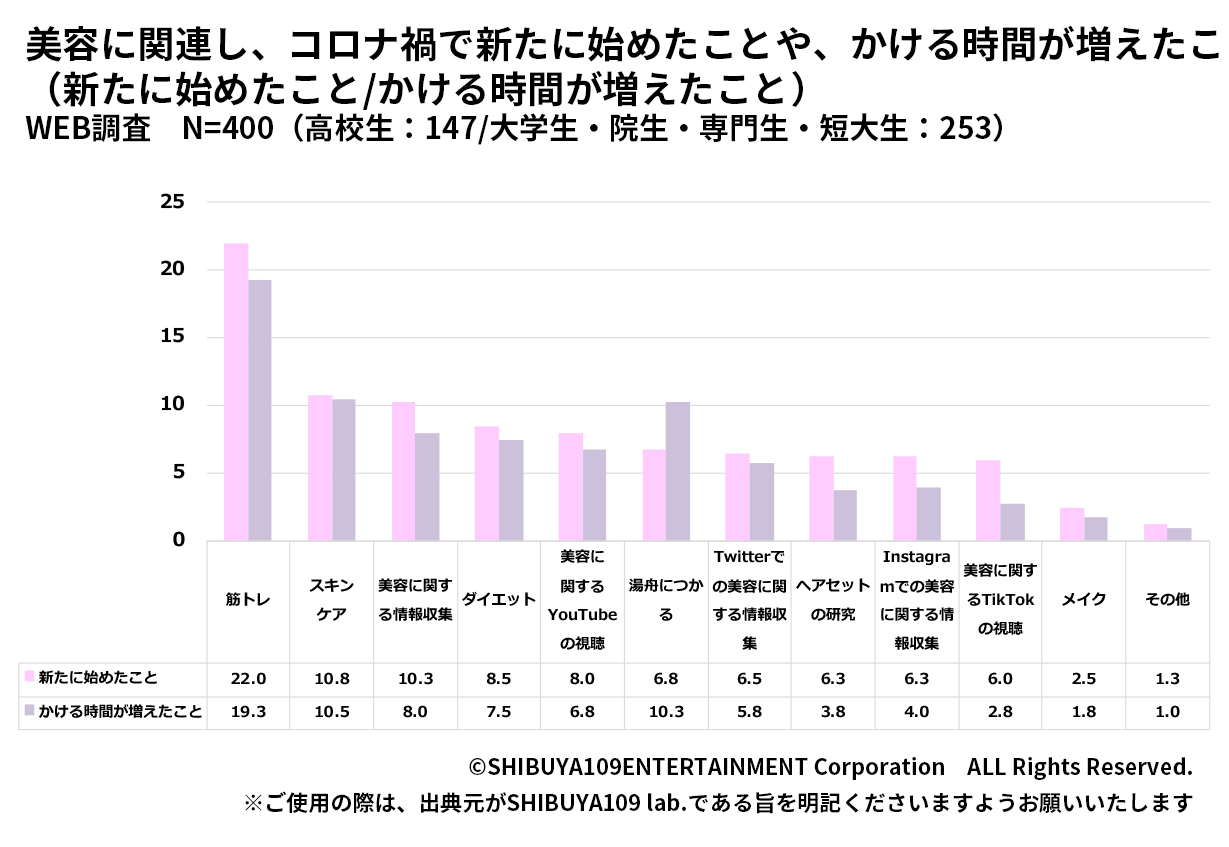 コロナ禍で美容に関連で新たに始めたことを聞いてみたところ、最も多いのは「筋トレ(22.0%)」、次いで「スキンケア(10.8%)」、「美容に関する情報収集(10.3%)」という結果となり、また普段かける時間が増えたことについては「湯船につかる(10.3%)」がランクインしました。