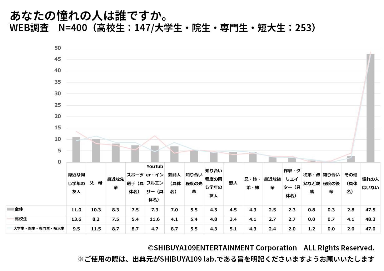 最も多い回答は「身近な同じ学年の友人(11.0%)」、次いで「父・母(10.3%)」「身近な先輩(8.3%)」という結果となりました。