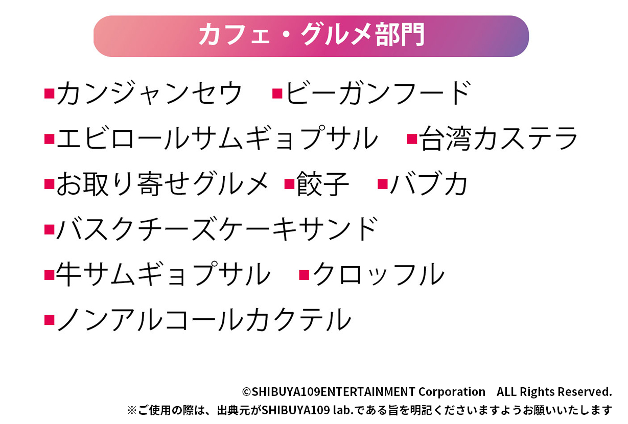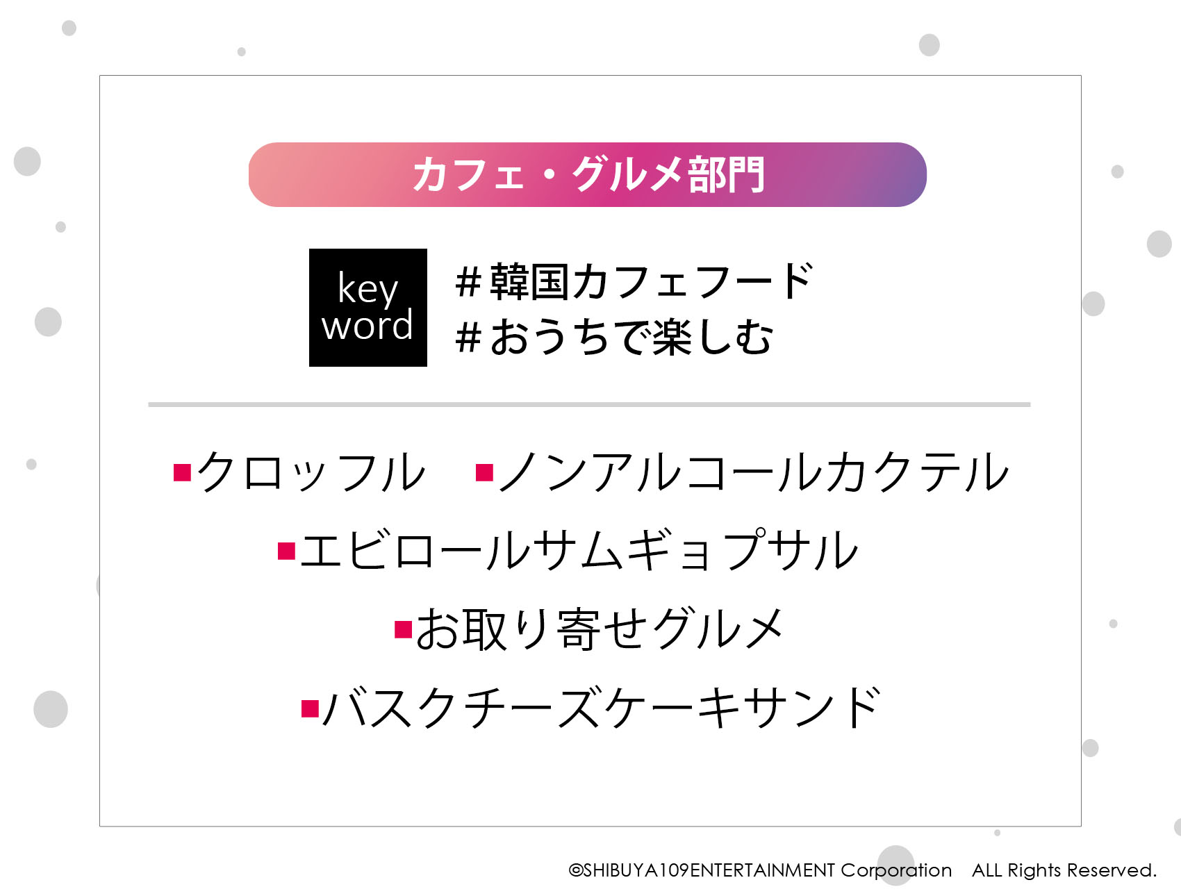 SHIBUYA109 lab.トレンド予測2021では、「カフェ・グルメ部門」「モノ・コト部門」「ヒト部門」「アーティスト部門」の4つの部門でトレンド予測を決定。