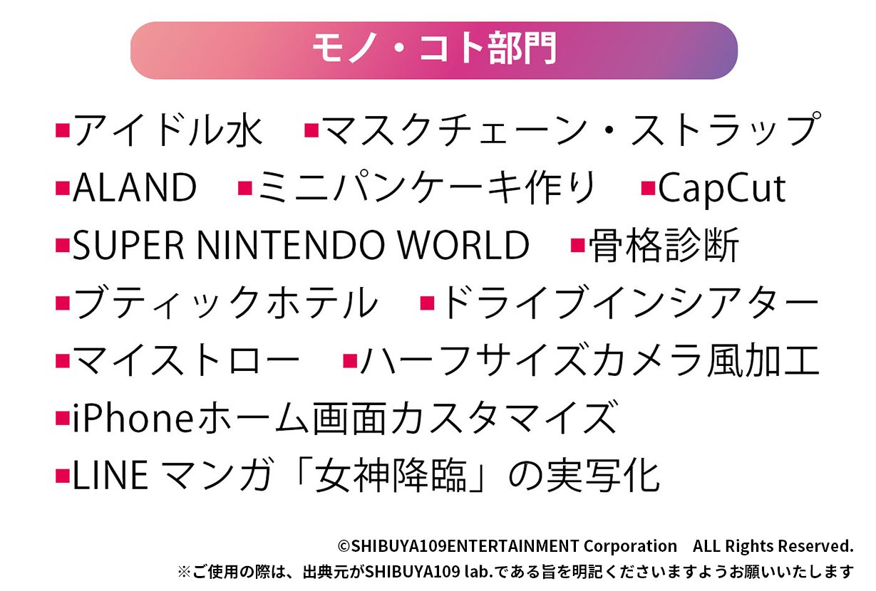 ノミネートを基に、各部門についてSHIBUYA109ガールズ300人にアンケート調査を実施。各部門のトレンド予測に選ばれたのはこちら!