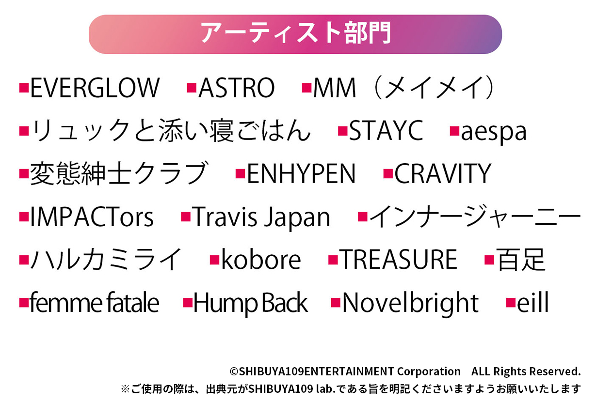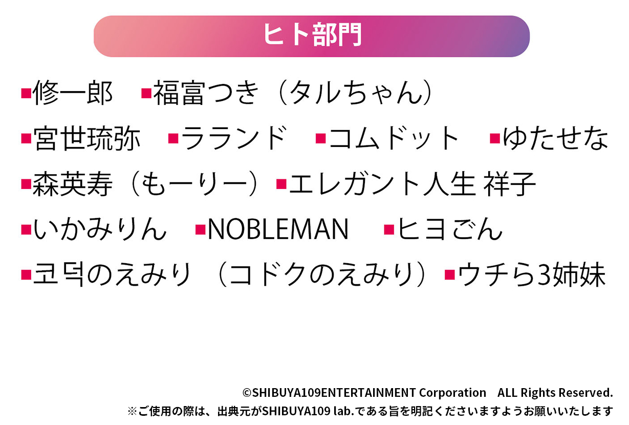 上記に加え、SHIBUYA109 lab.の保有する独自ネットワークから計12名の高校生・大学生とSHIBUYA109 lab.で各部門ごとにノミネートをピックアップ。