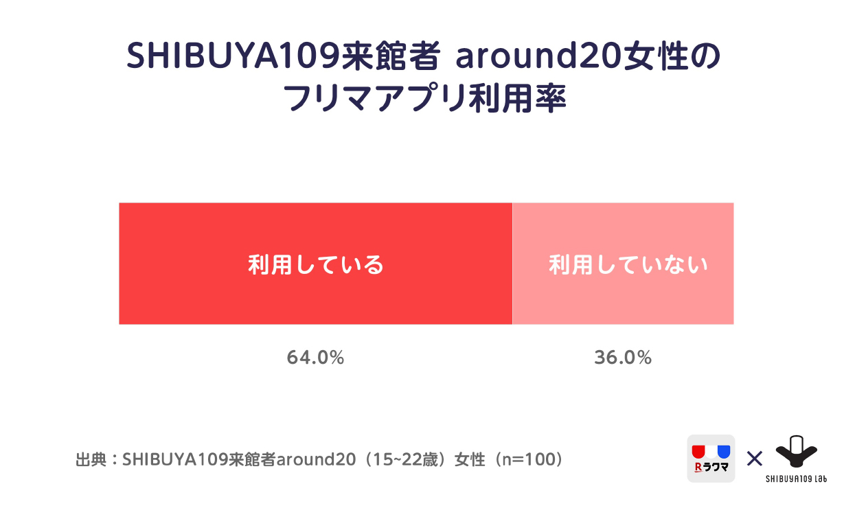 SHIBUYA109館内調査にて、フリマアプリの利用状況を聞いてみたところ、64.0%のaround20がフリマアプリを使用していることが明らかになりました。