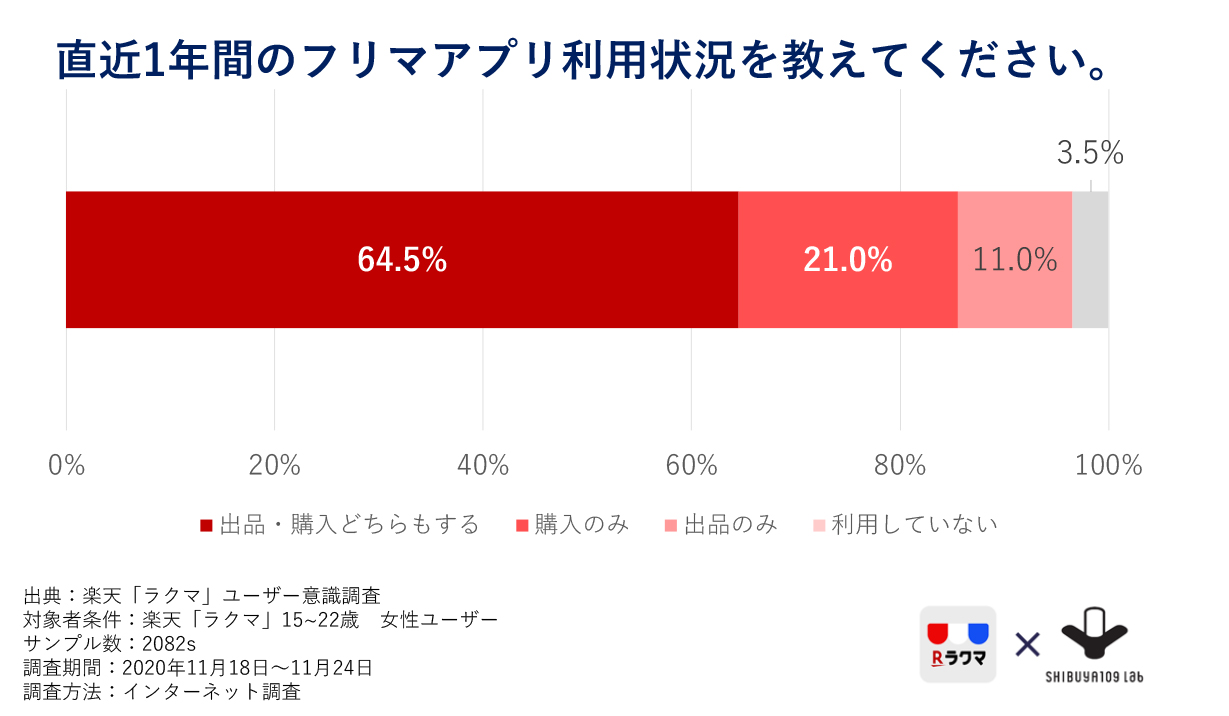 また楽天「ラクマ」の15~22歳 女性ユーザーを対象とした調査にて、直近一年間のフリマアプリの利用状況を聞いてみたところ、「出品・購入どちらもする」と回答した人が64.5%という結果となりました。SHIBUYA109来館者を対象にしたグループインタビューでも「フリマアプリでは整理整頓を目的に不要になったものを出品し、レアでなかなか手に入らないものや、定価だと手が出ない商品を購入している」「不要になったアイテムを出品し、売り上げで新しい商品を購入する」という声が多く聞かれています。