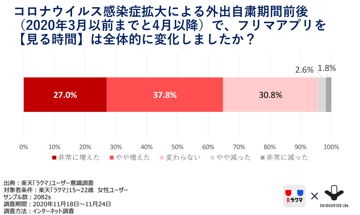 では、生活環境が大きく変化した2020年、around20達の間ではどのような消費が生まれていたのでしょうか。楽天「ラクマ」の15~22歳 女性ユーザー向けアンケート調査にて、コロナウイルス感染症拡大による外出自粛期間前後(2020年3月以前までと4月以降)でのフリマアプリを【見る時間】の変化について聞いたところ、64.8%の人が「非常に増えた」「やや増えた」と回答しました。