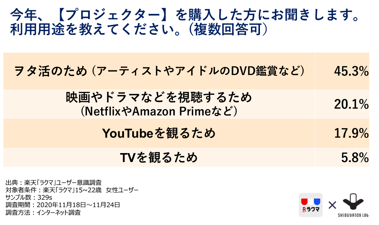 楽天「ラクマ」ユーザーのアンケート調査にて、プロジェクター購入者を対象に、プロジェクターの利用用途を聞いてみたところ、「ヲタ活のため」と回答した人が45.3%と最多でした。SHIBUYA109来館者のグループインタビューでも「リビングではなく、自分のお部屋でコンテンツを楽しむため、TVよりも安いプロジェクターを購入した」「自分のお部屋で好きなアイドルの動画を鑑賞するために購入した」という声が多く聞かれています。