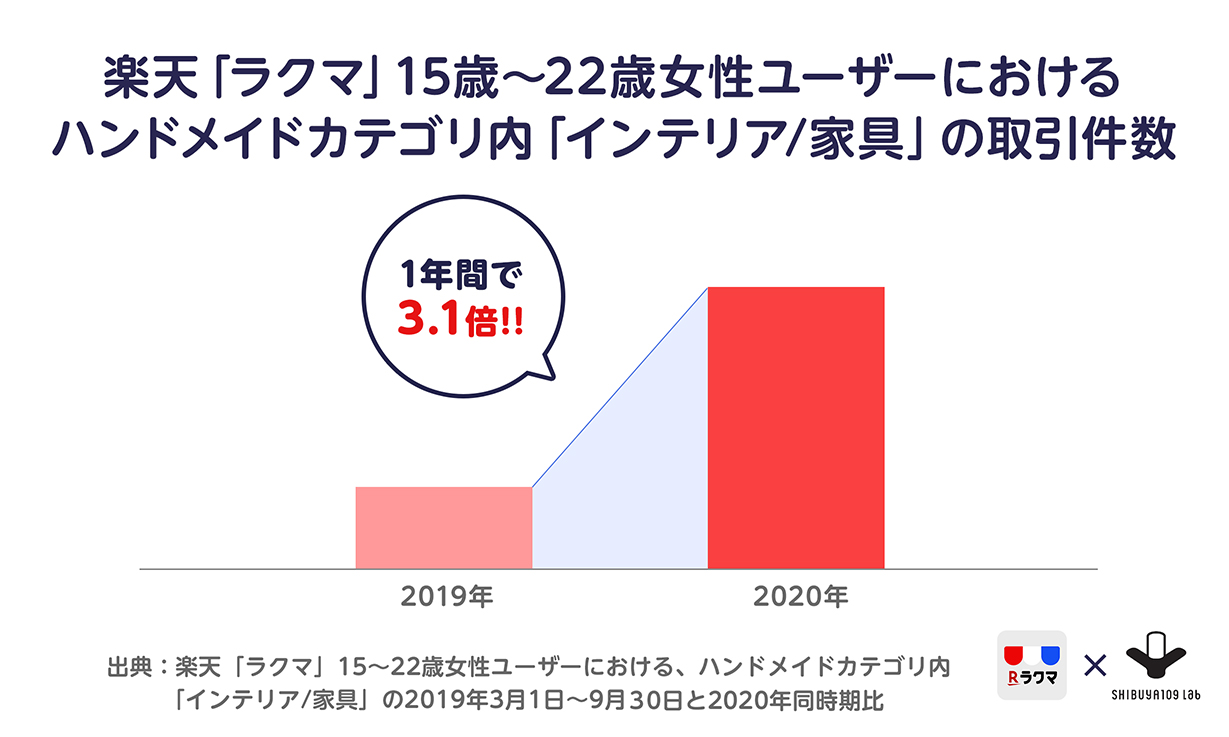楽天「ラクマ」におけるaround20ユーザーにおいて、ハンドメイドカテゴリの「インテリア/家具」の取引件数が2019年と比較し3.1倍に及んだことも、2020年の大きな特徴です。(出典:楽天「ラクマ」15歳~22歳女性ユーザーの取引件数。2019年3月1日~9月30日と2020年の同時期比)