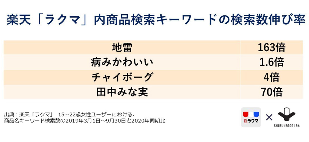 ヲタのファッションテイストの表現として使われ、白・黒・ピンクを基調としたダークな雰囲気のあるガーリーな服装を指す「地雷」は、 2020年は2019年と比較して163倍、「病みかわいい」は1.6倍検索されたという結果となりました(出典:楽天「ラクマ」15歳〜22歳女性ユーザーの取引件数。2019年3月1日~9月30日と2020年の同時期比)