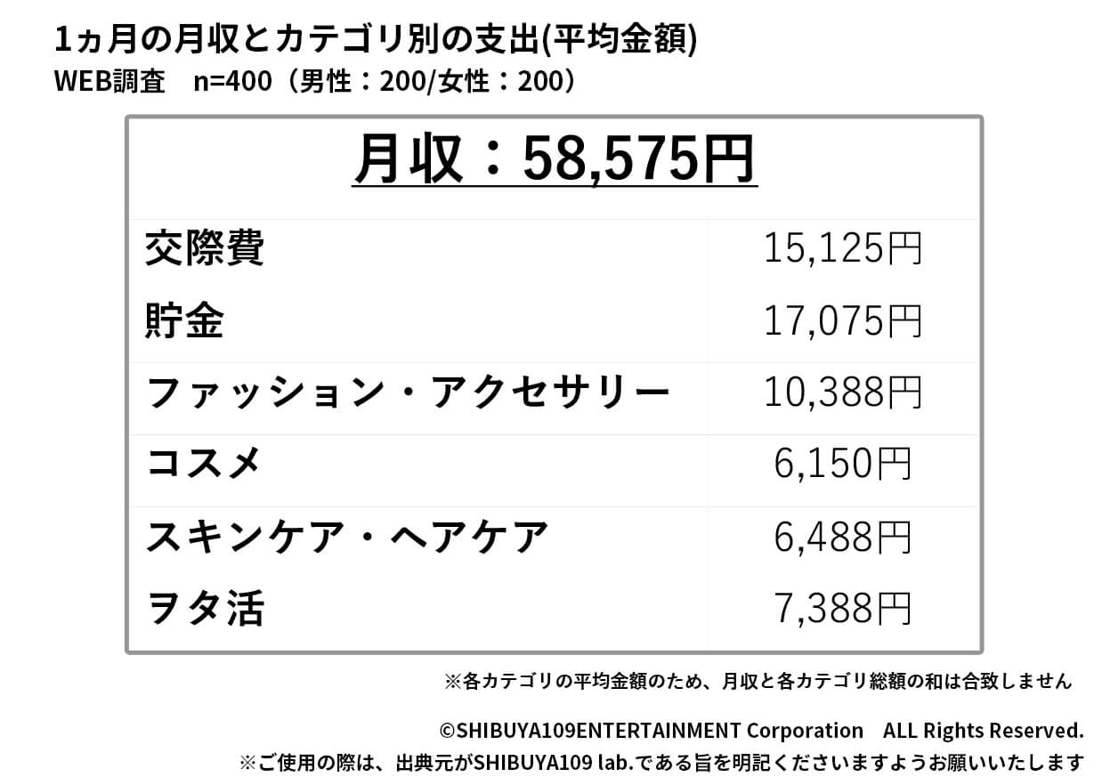 月収の使い道について聞いてみたところ、最も多いのは「交際費(23.5%)」、次いで「貯金(14.5%)」「ファッション・アクセサリー(14.0%)」となり、各カテゴリの支出平均額は交際費は15,125円/月、貯金は17,075円/月、ファッション・アクセサリーは10,388円/月ということが分かりました。