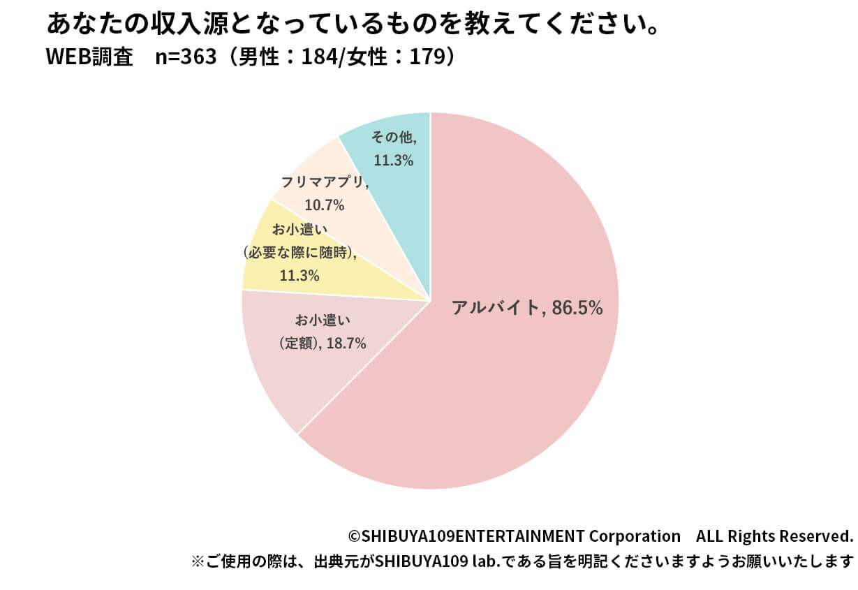月収について聞いてみたところ、平均金額は58,575円となり、最も多い収入源はアルバイト(86.5%)、定額のお小遣いによる収入を得ている若者は18.7%という結果となりました。