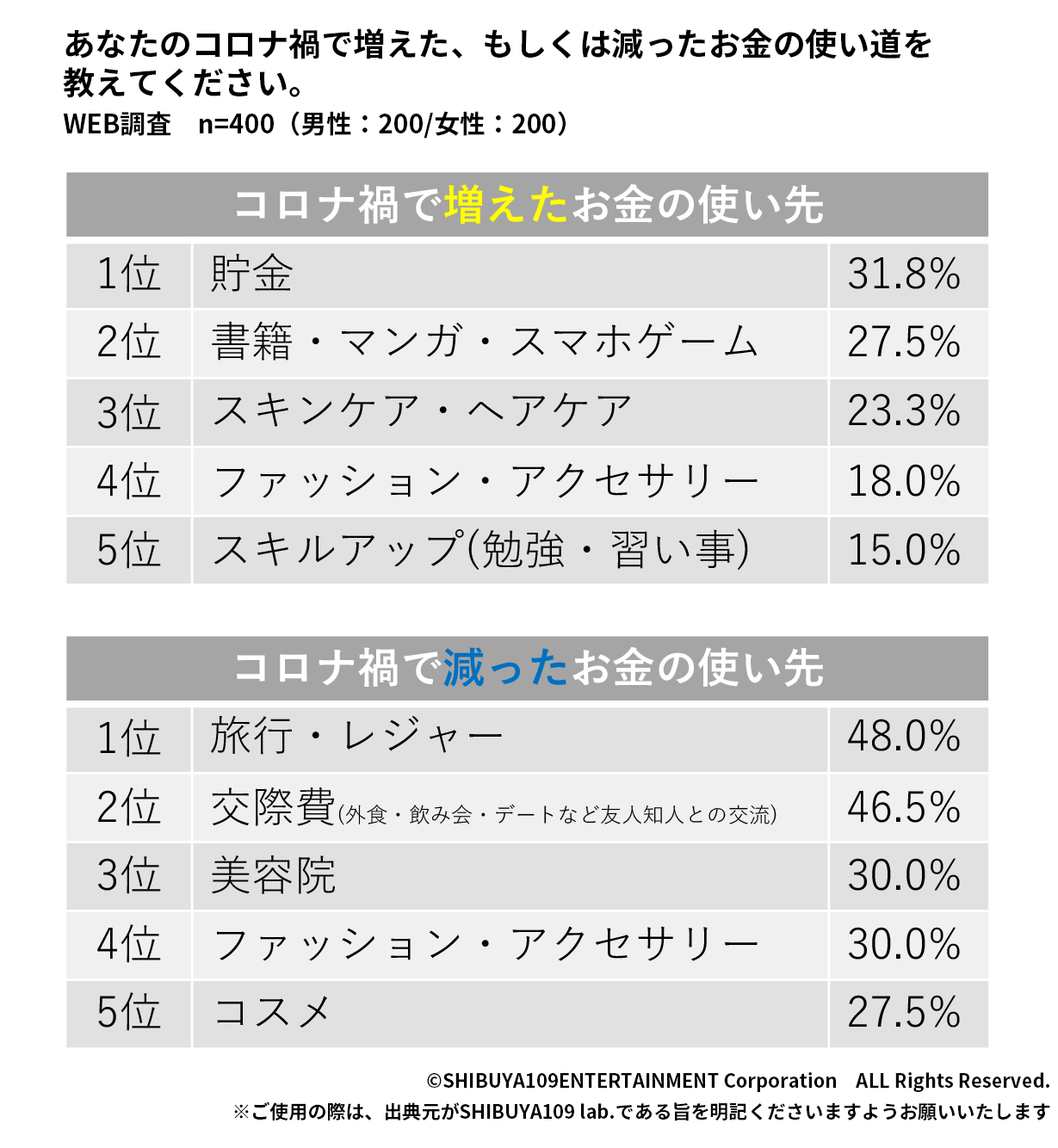 コロナ禍での支出が増えたカテゴリ第1位は「貯金(31.8%)」、第2位「書籍・漫画、TVゲーム・スマホゲーム(27.5%)」、第3位「スキンケア・ヘアケア(23.3%)」となり、逆に支出が減ったカテゴリについては第1位「旅行・レジャー(48.0%)」第2位「交際費(46.5%)」第3位「美容院(30.0%)」という結果となりました。