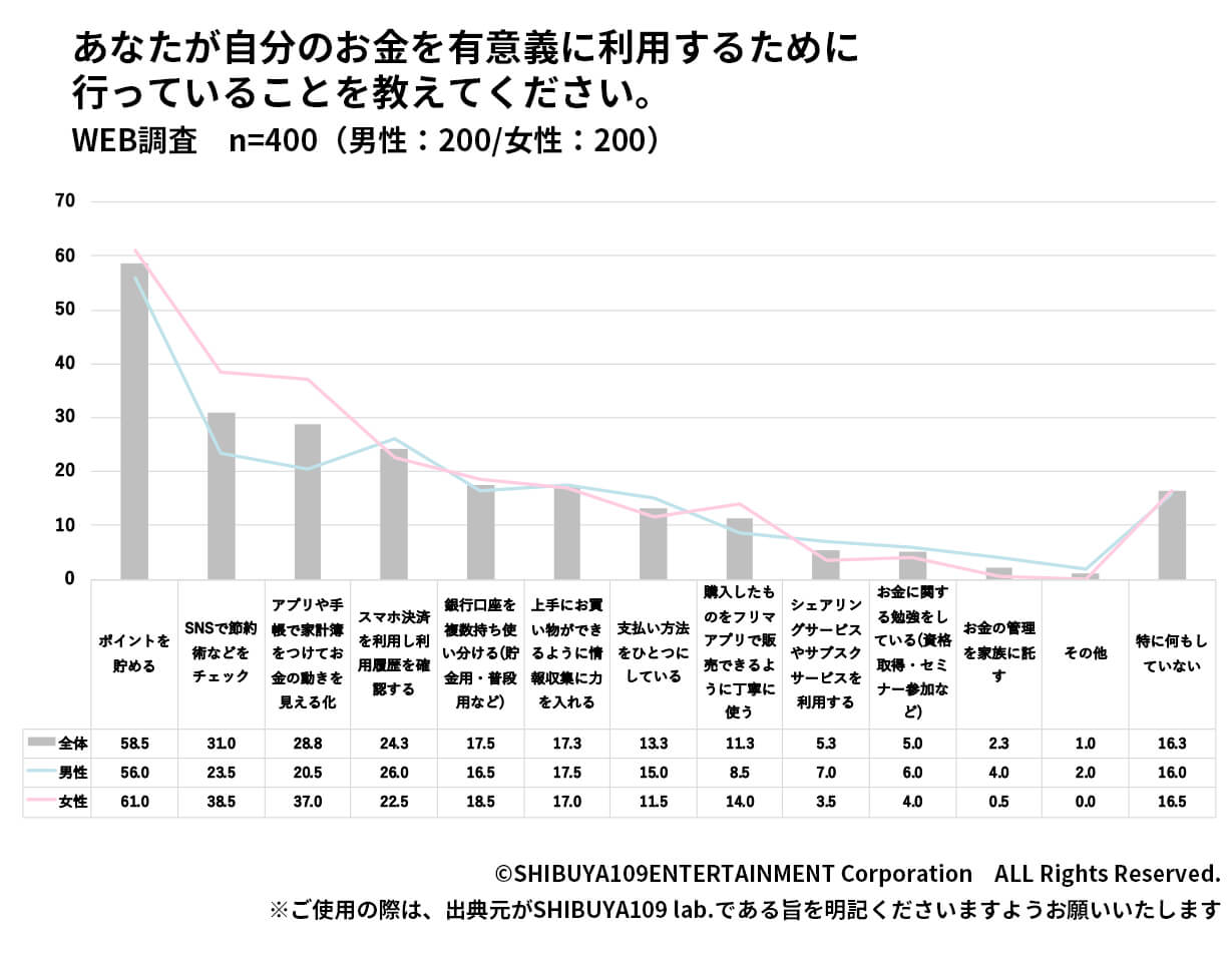 主な収入源がアルバイトの報酬である若者は、シフトの増減が影響するため、収入が不安定であることから、お金のやりくりスキルが高い傾向にあります。お金を有意義に使用するために行っていることを聞いてみたところ、最も多い回答は「ポイントを貯める(58.5%)」、次いで「SNSで節約術をチェック(31.0%)」、「家計簿をつける(28.8%)」という結果となりました。