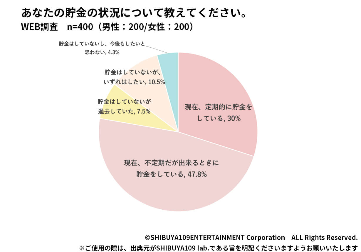 現在の貯金状況について聞いてみたところ、77.8%が「現在貯金をしている」と回答しており、うち47.8%が「不定期だが出来るときに貯金をしている」、30.0%が「定期的に貯金をしている」ということが明らかになりました。お金を使うことに慎重である姿勢も見られています。