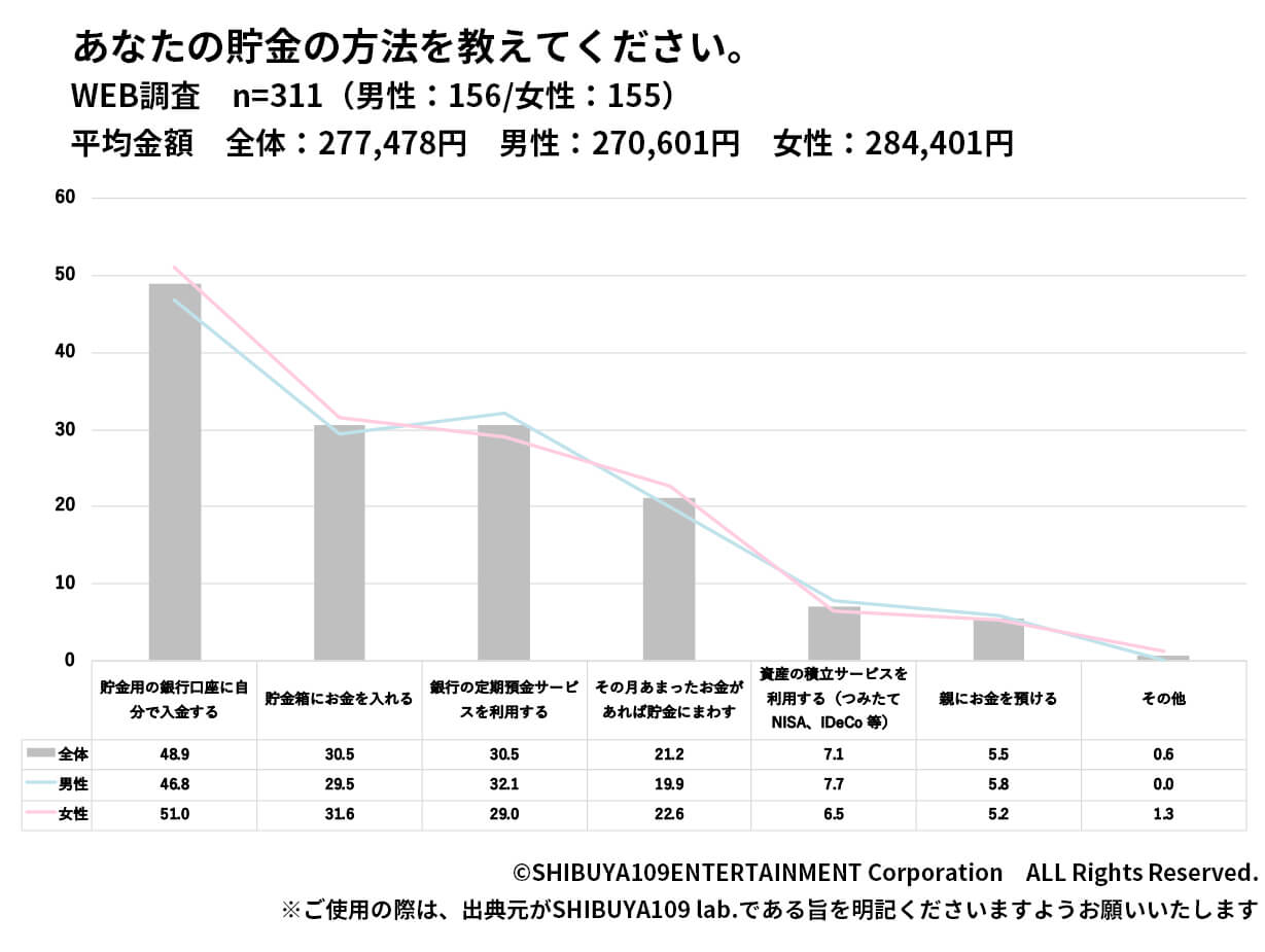 貯金の総額は平均277,478円でした。貯金をしている理由について聞いてみたところ、最も多い回答は「もしもの時のため(46.3%)」次いで「欲しいものがあるから(29.3%)」「貯金が楽しいから(23.5%)」という結果となりました。