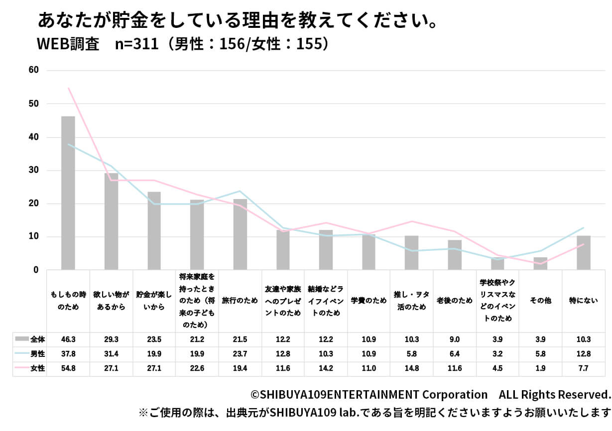 「もしもの時のため」の具体的な内容について、グループインタビューでは「旅行に行きたいとか、何か大きな出費があるときのため」「留学など自分にチャンスが回ってきた時に、お金が出せるようにしたい」「パソコンなど、すごく欲しいけど高額なものがあったときに、貯金から支払えるようにするため」など、10年、20年後など遠い将来のためではなく、どちらかというと近い将来に起こりうる、ポジティブな”もしも”を指していることが分かります。