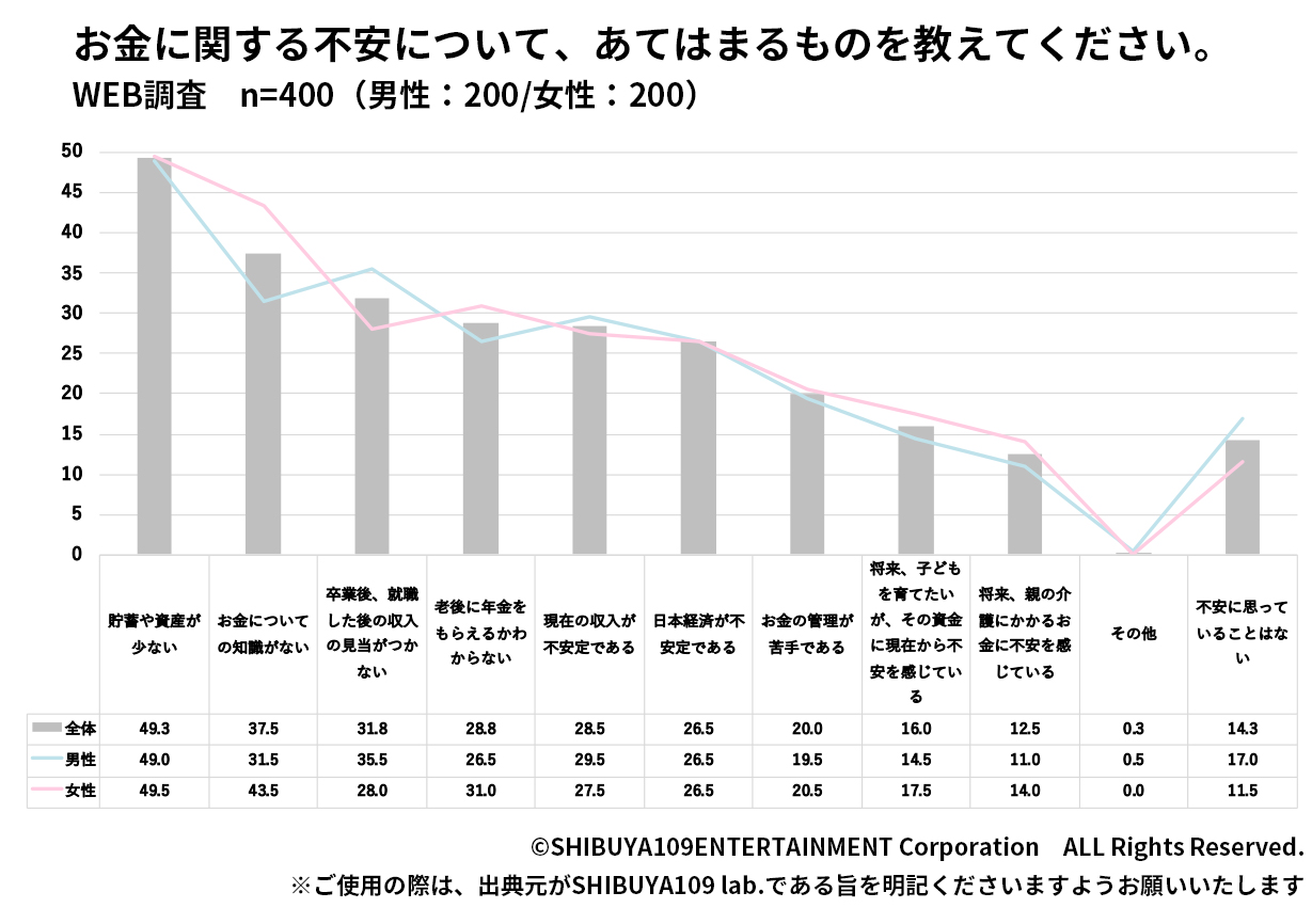 若者がお金に関して不安に感じることとして「貯蓄や資産が少ない(49.3%)」の次に「お金についての知識がない(37.5%)」が挙げられており、知識がないことで起こりうる失敗に対するリスクを感じ、慎重になっていることが考えられます。
