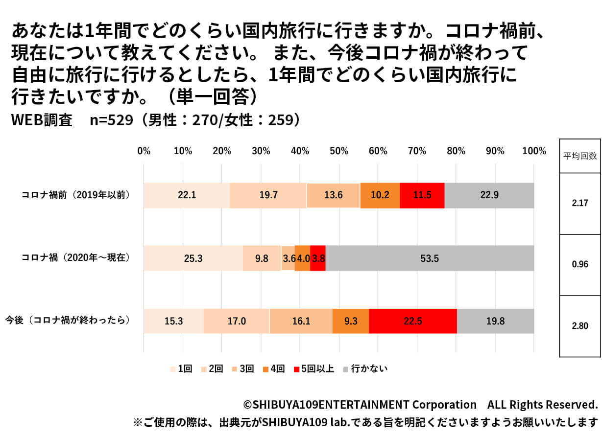 次に、大学生の国内旅行の実態について調査を行いました。まず、1年間の国内旅行の頻度について聞いたところ、コロナ禍前は平均2.17回、コロナ禍においては平均0.96回と激減しており、半数以上が国内旅行に行っていない結果となりました。しかし、コロナ禍が終息後の旅行意向について聞いたところ、平均2.80回と、コロナ禍前よりも高い数字となりました。体験価値を重視しているZ世代は、旅行に対する関心が高いため、現状は旅行を我慢していることが考えられます。コロナ禍終息後には、彼らの旅行欲が更に高まることが予測できます。
