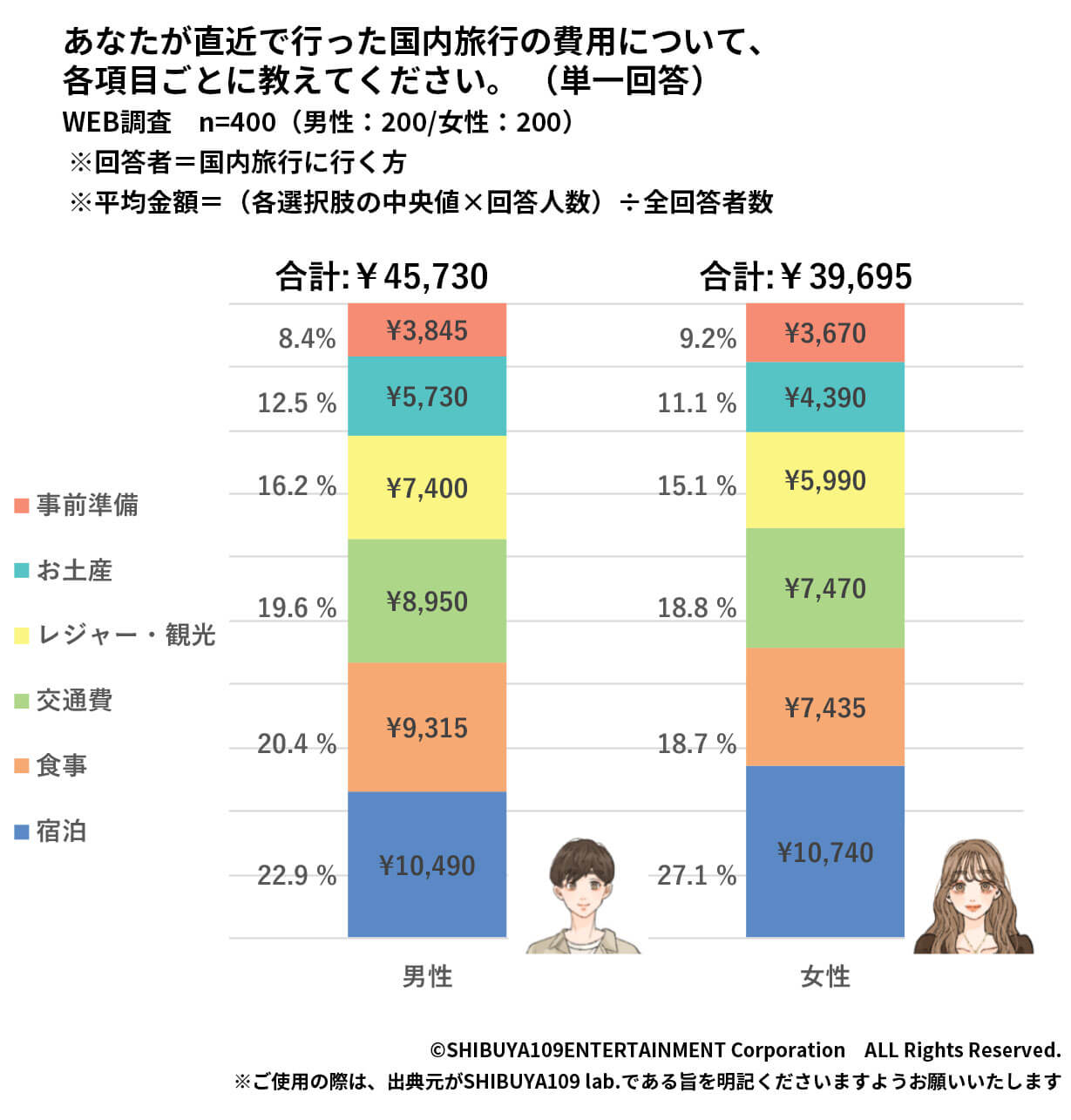 国内旅行費の平均は男子45,730円、女子39,695円 !男子は日常の延長、女子は非日常・特別感を旅行で楽しむ