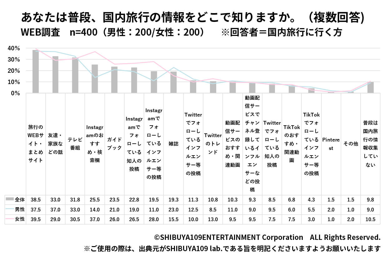 デジタルネイティブと言われるZ世代は、旅行に関してどのように情報収集やSNSの投稿を行っているのでしょうか。まず普段の国内旅行の情報収集方法を聞いたところ、「旅行のWEBサイト・まとめサイト(38.5%)」、「友達・家族などの話(33.0%)」、「テレビ番組(31.8%)」という結果となりました。