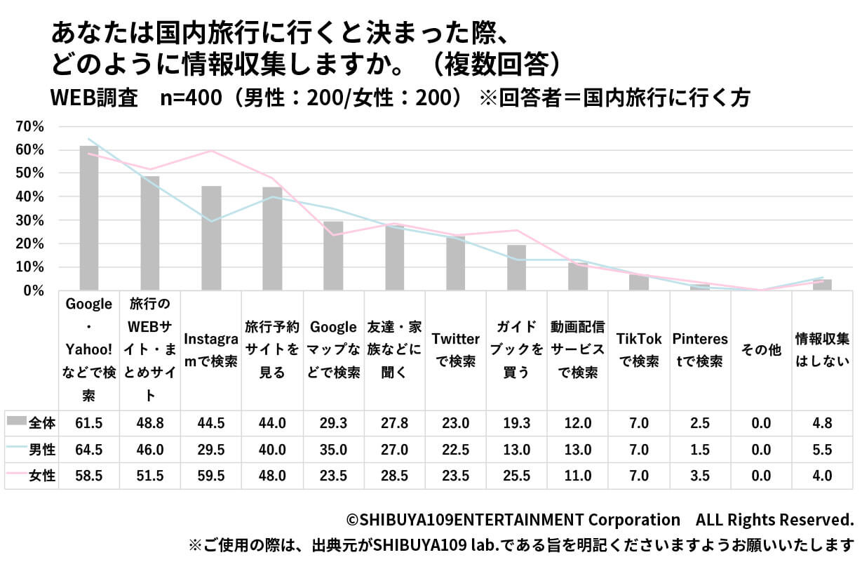 次に、旅行が決まった後の情報収集方法について聞いたところ、「Googleなどで検索(61.5%)」、「旅行のWEBサイト・まとめサイト(48.8%)」、「Instagram(44.5%)」が上がりました。男子は「Googleなどで検索(64.5%)」、「Googleマップなどで検索(35.0%)」が高く、女子は「Instagram(59.5%)」、「ガイドブック(25.5%)」が高く、男女による検索方法の違いが見られました。