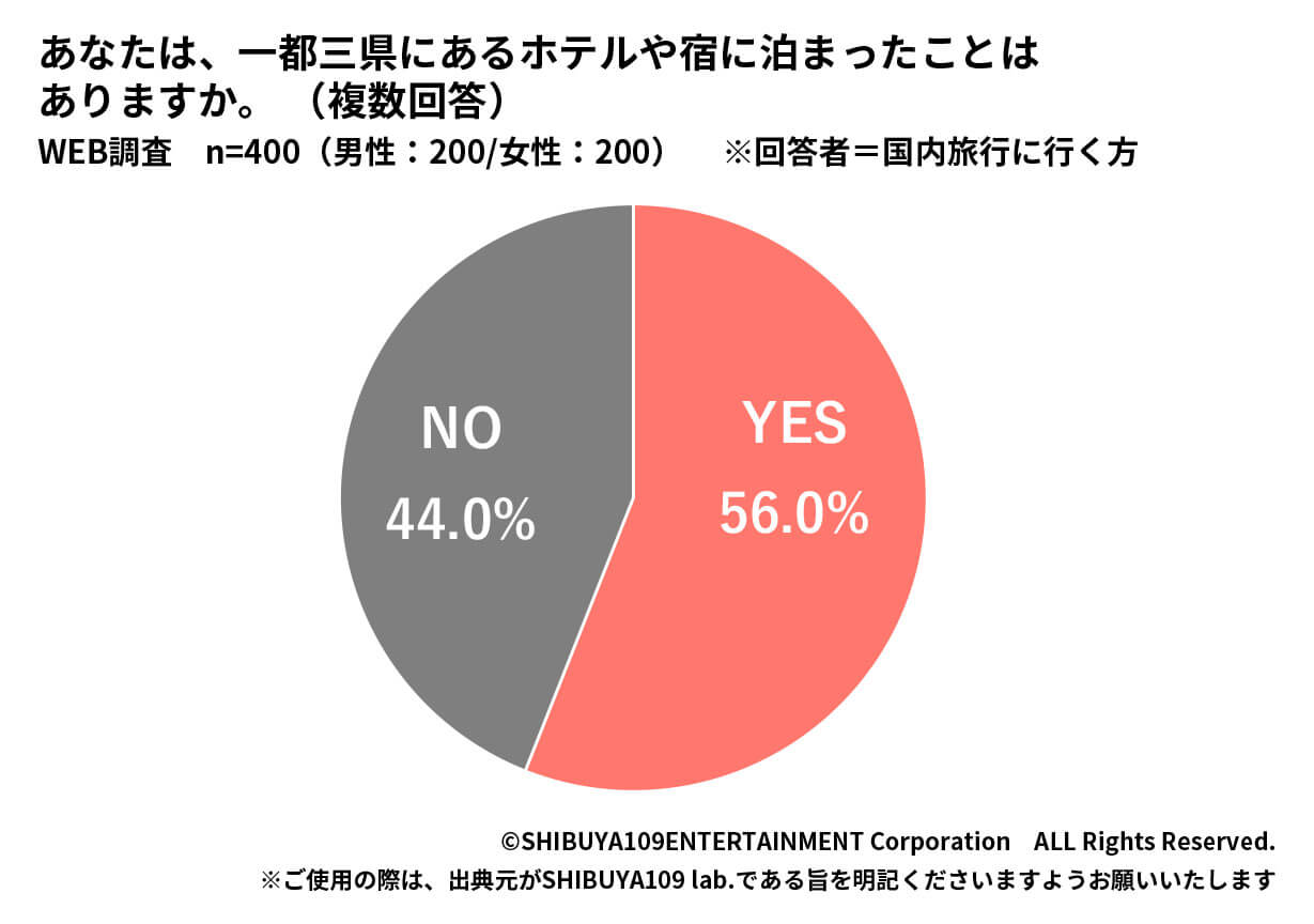 一都三県にある宿泊施設の利用について聞いたところ、56.0%が利用したことがあると回答し、都内のホテルなどを利用した遊び方も増えています。