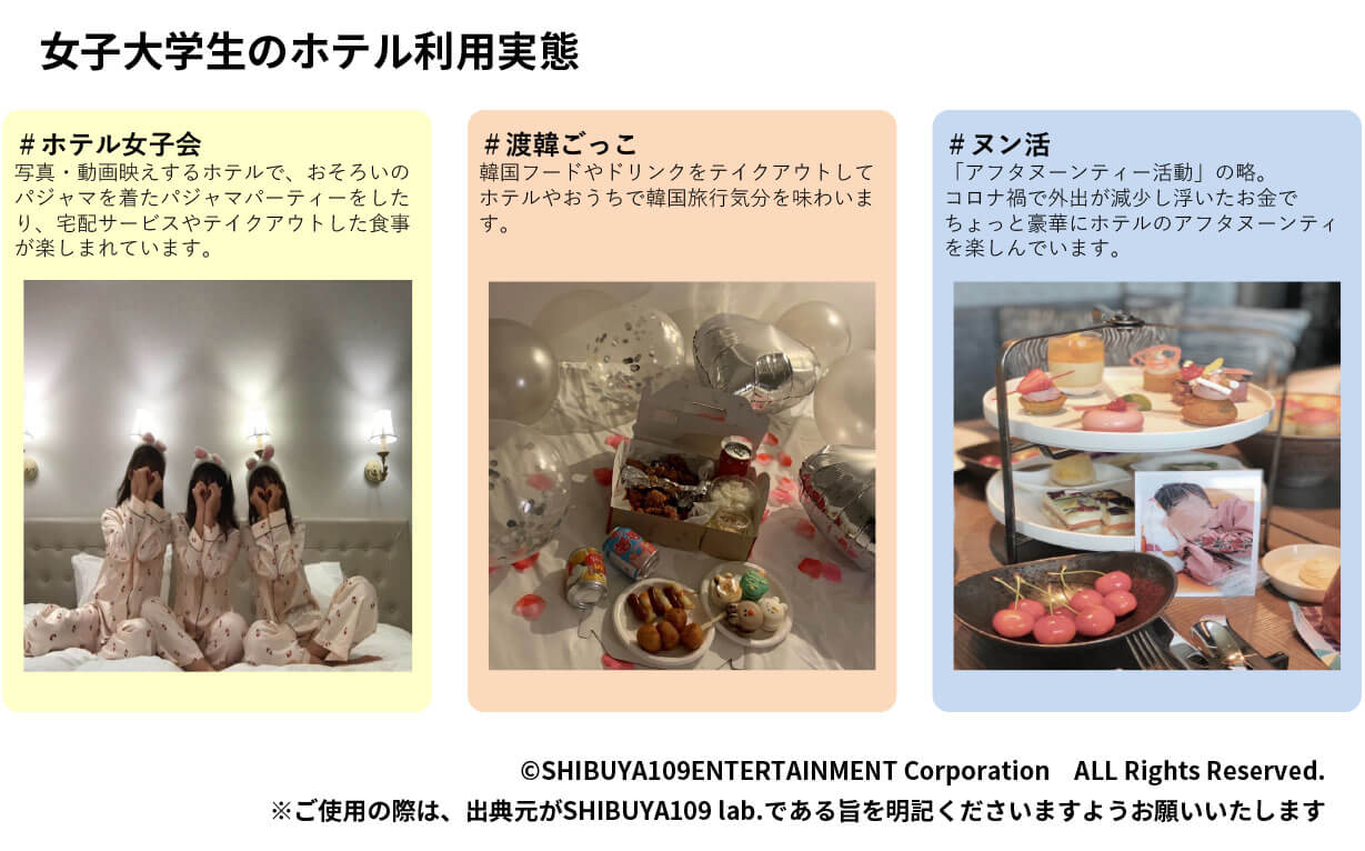 グループインタビューでは、「TikTokで知った都内のかわいいホテルで女子会をした。(女子大学生)」「都内のホテルに泊まって、韓国のラーメンやチーズボールなどを買って、韓国気分を味わう#渡韓ごっこをした。(女子大学生)」といった声が聞かれました。
