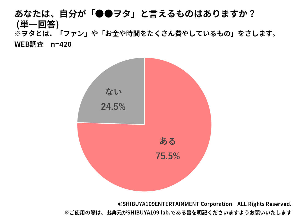 今回の調査の際に「自分が『〇〇ヲタ』と言えるものはありますか。」と聞いたところ、75.5%の人が「ある」と回答し、何かしらのヲタであると自覚していることが明らかになりました。