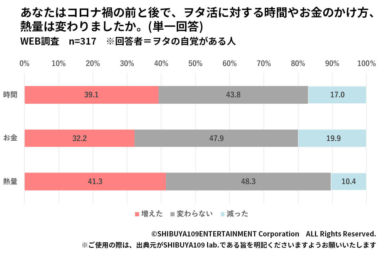 時間が「増えた(39.1%)」、お金が「増えた(32.2%)」、熱量が「増えた(41.3%)」と、いずれも減った割合よりも増えた割合が多い結果となりました。時間とお金に関しては80%以上が増えたもしくは変わらないと回答、熱量は約90%が増えたもしくは変わらないと回答し、コロナ禍でもヲタ活の熱を感じる結果となりました。