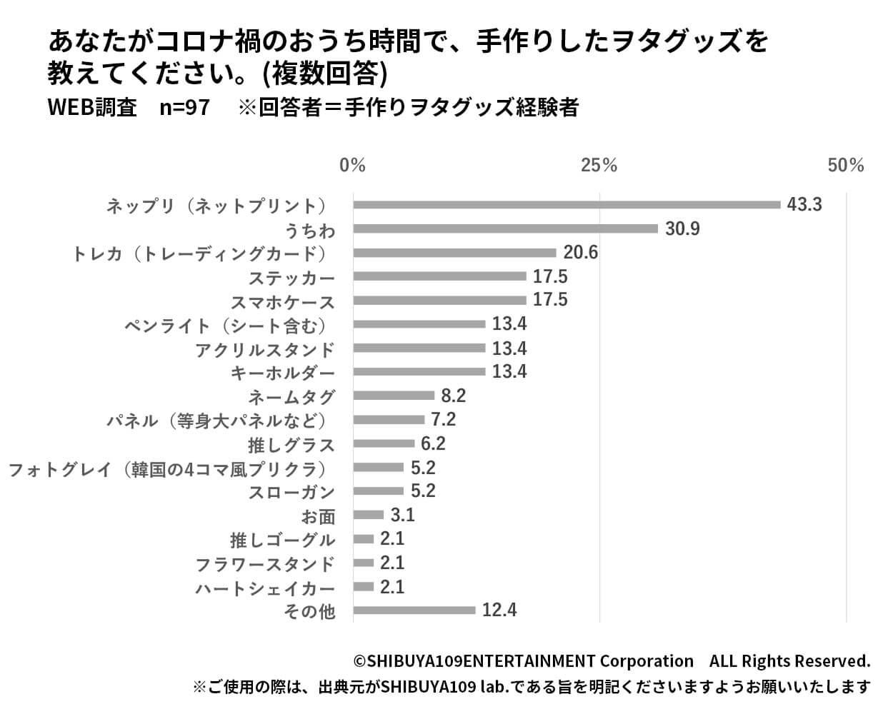手作りしたヲタグッズを聞いたところ、1位「ネップリ(ネットプリント)(43.3%)」、2位「うちわ(30.9%)」、3位「トレカ(トレーディングカード)(20.6%)」となりました。 また、今年ならではのトレンドとして、「推しグラス(6.2%)」、「推しゴーグル(2.1%)」もSNS上で盛り上がりを見せており、自分の推しの名前を使った手作りグッズが増えています。
