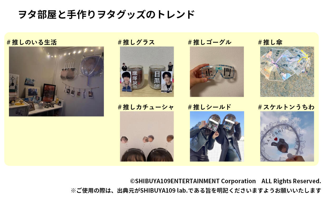 グループインタビューでも、「スケルトンうちわや推しグラス、推しゴーグルをTikTokやInstagramで見て、マネして作った。」といった声があがり、「アクキー(アクリルキーホルダー)を飾るためにワイヤーネットを買った。」「ネップリ(ネットプリント)でメンバー全員分コピーして壁に貼っている。コロナ禍で、周りでもおうちの中でヲタグッズを飾る人が増えた気がする。」といったおうちの中でヲタ活を楽しむ声も多くあがりました。