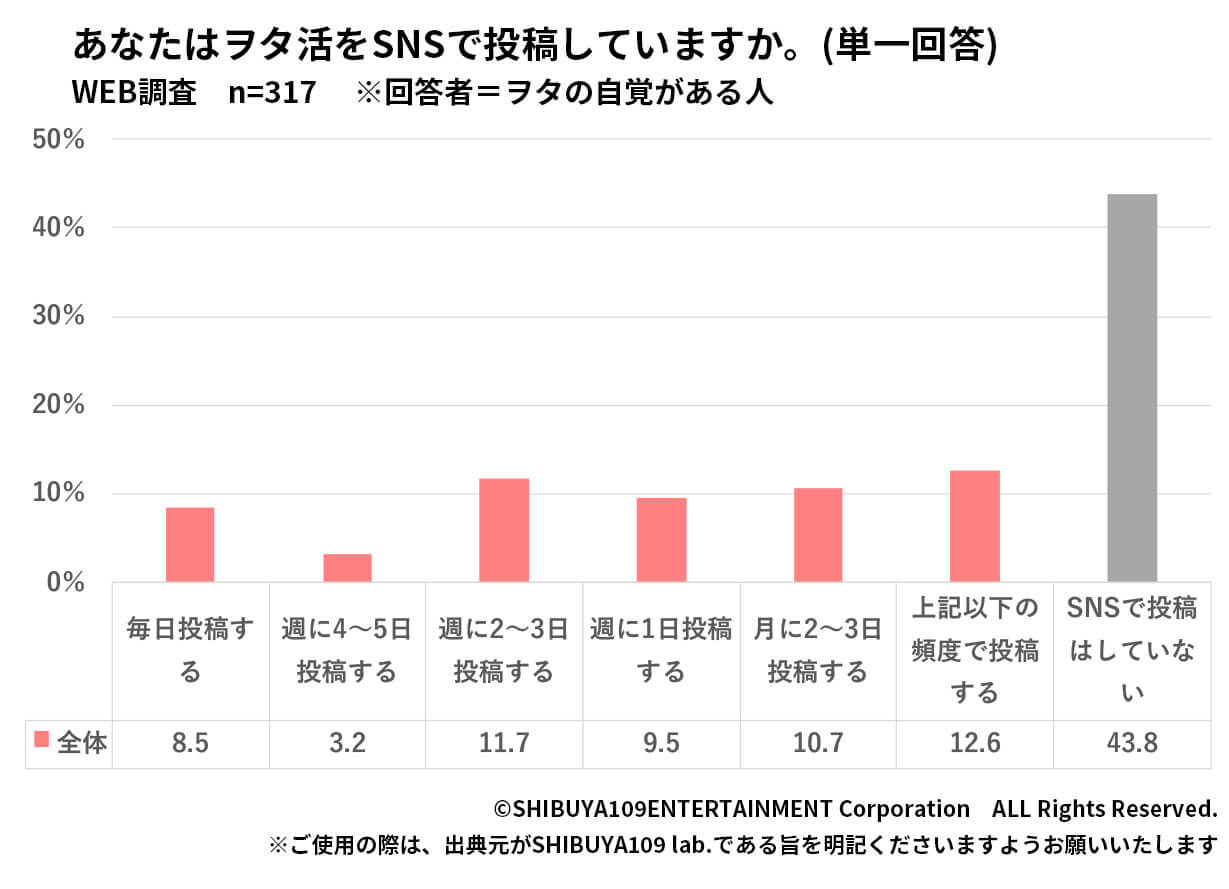 コロナ禍でも活発にヲタ活を楽しんでいるZ世代ですが、その活動に欠かせないのがSNSです。SNSでのヲタ活に関する投稿状況について聞いたところ、6割近くが投稿しており、週に4~5日以上投稿する人が10%以上となりました。