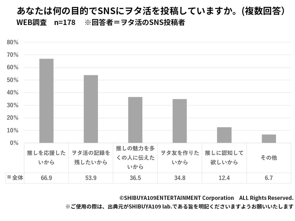 また、SNSに投稿する理由を聞いたところ、「推しを応援したいから(66.9%)」、「ヲタ活の記録を残したいから(53.9%)」、「推しの魅力を多くの人に伝えたいから(36.5%)」という結果となり、「ヲタ友を作りたいから(34.8%)」も特徴的な結果となりました。