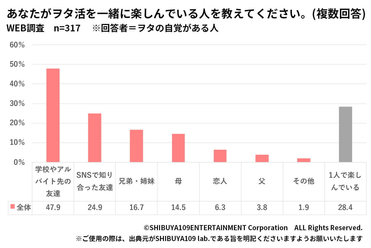 実際にヲタ活を一緒に楽しんでいる相手を聞いたところ、「学校やアルバイト先の友達(47.9%)」に次いで「SNSで知り合った友達(24.9%)」がランクインする結果となりました。